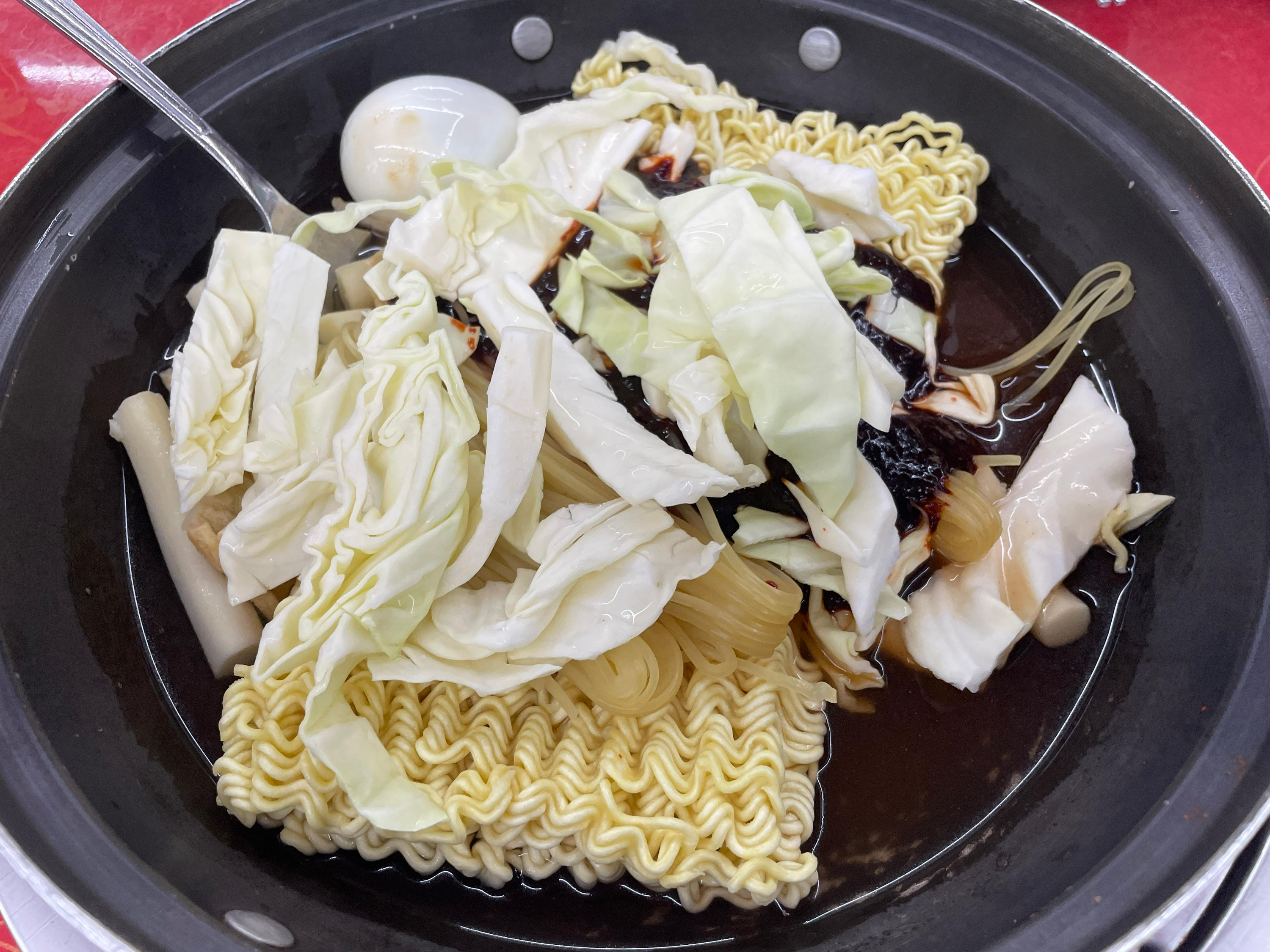 즉석떡볶이 1인분, 라면+쫄면사리 1개, 삶은계란1개, 무침군만두 8개, 오뎅2개, 순대1개 : 주문완료 (성인여자 2명)
