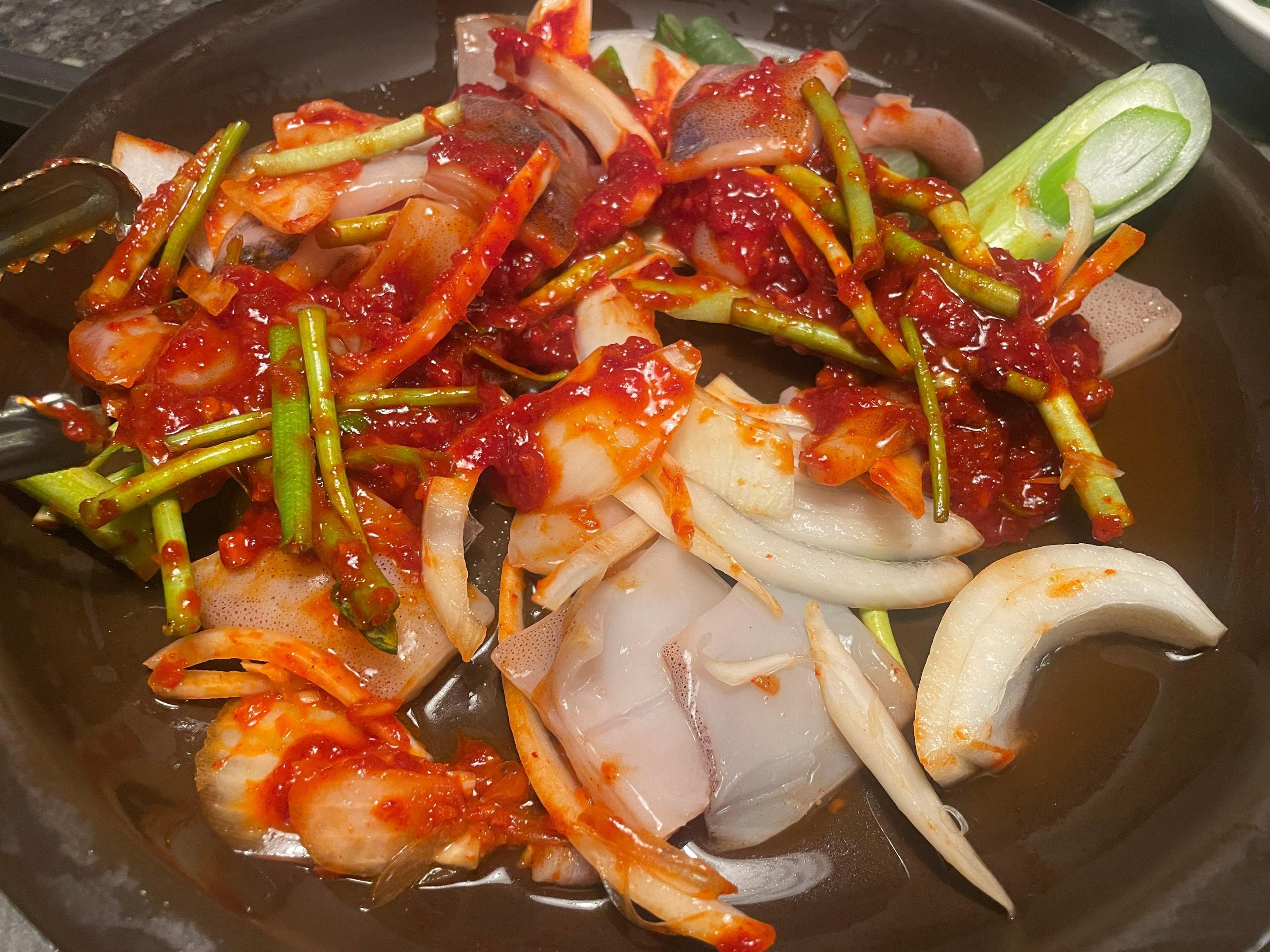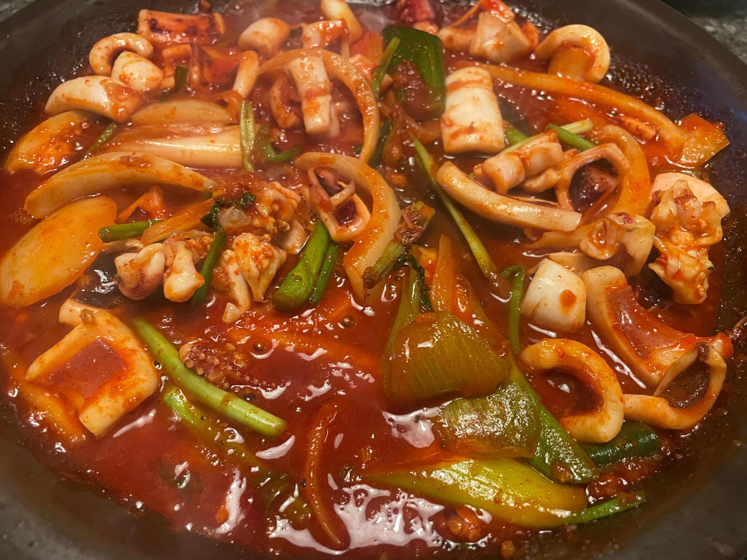 드디어 지글지글 볶아지는 오징어볶음완성~ 간도 적당하고 저에게는 너무나도 추억의 오징어볶음이라