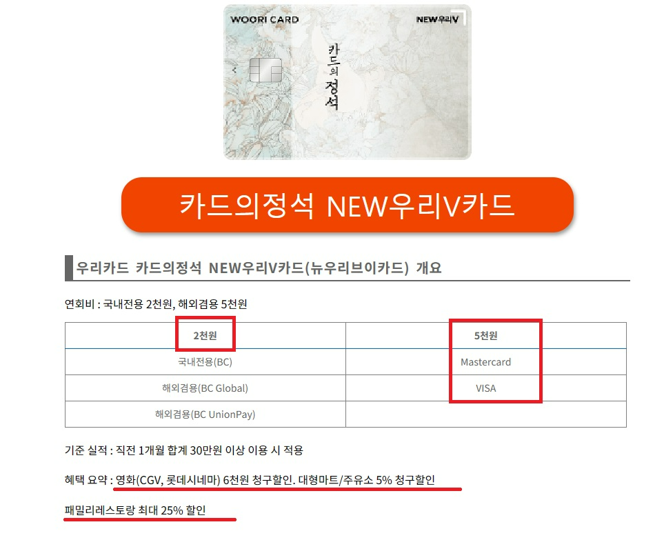카드의정석 NEW우리V카드의 좋은 점은 제가 볼 땐 딱 패밀리레스토랑,영화,주유에 진짜 할인이 좋은 카드예요