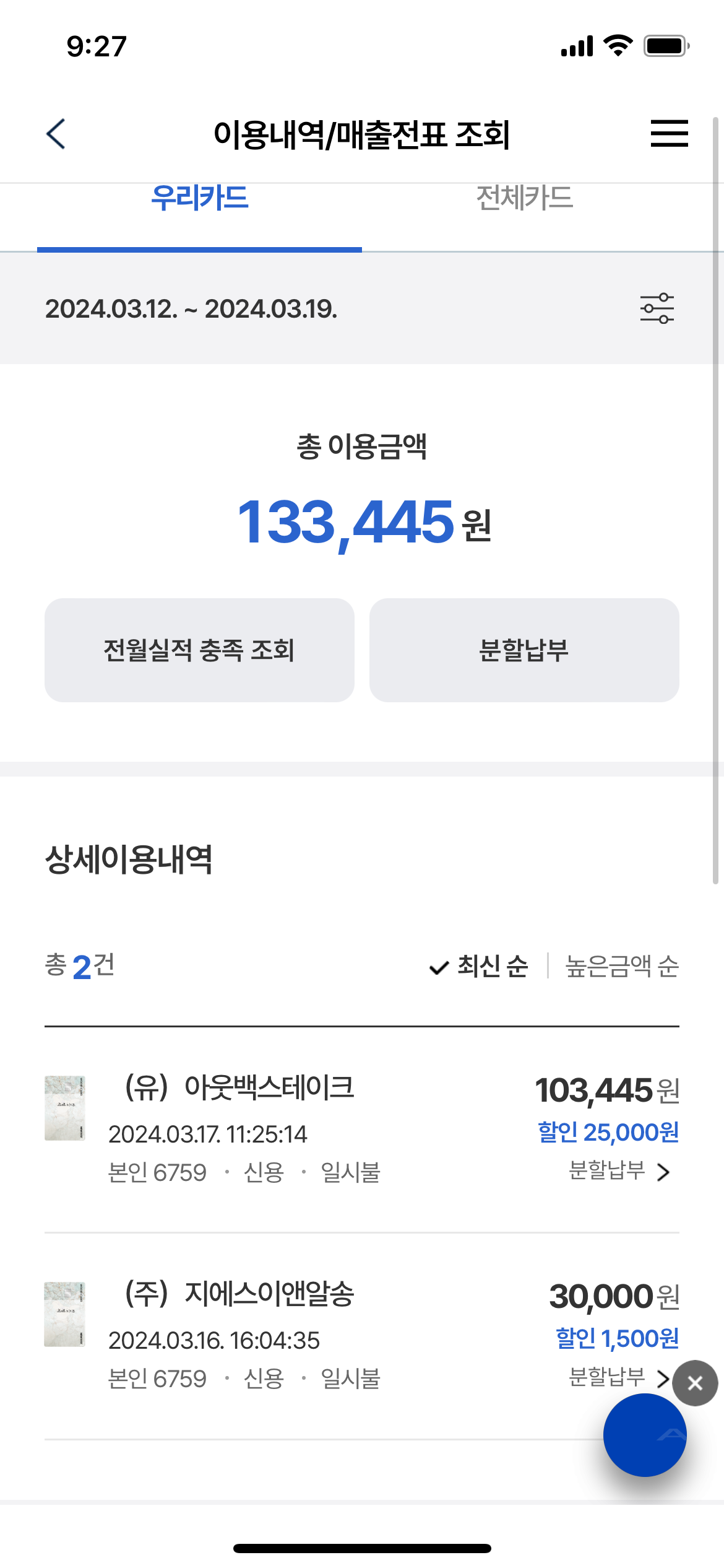 다음날 우리카드 어플을 확인하니 25% 청구할인이 완료 25,000원 최대금액을 할인받아서 75,000원정도에 4식구 아주 배부르게 먹고 나왔습니다