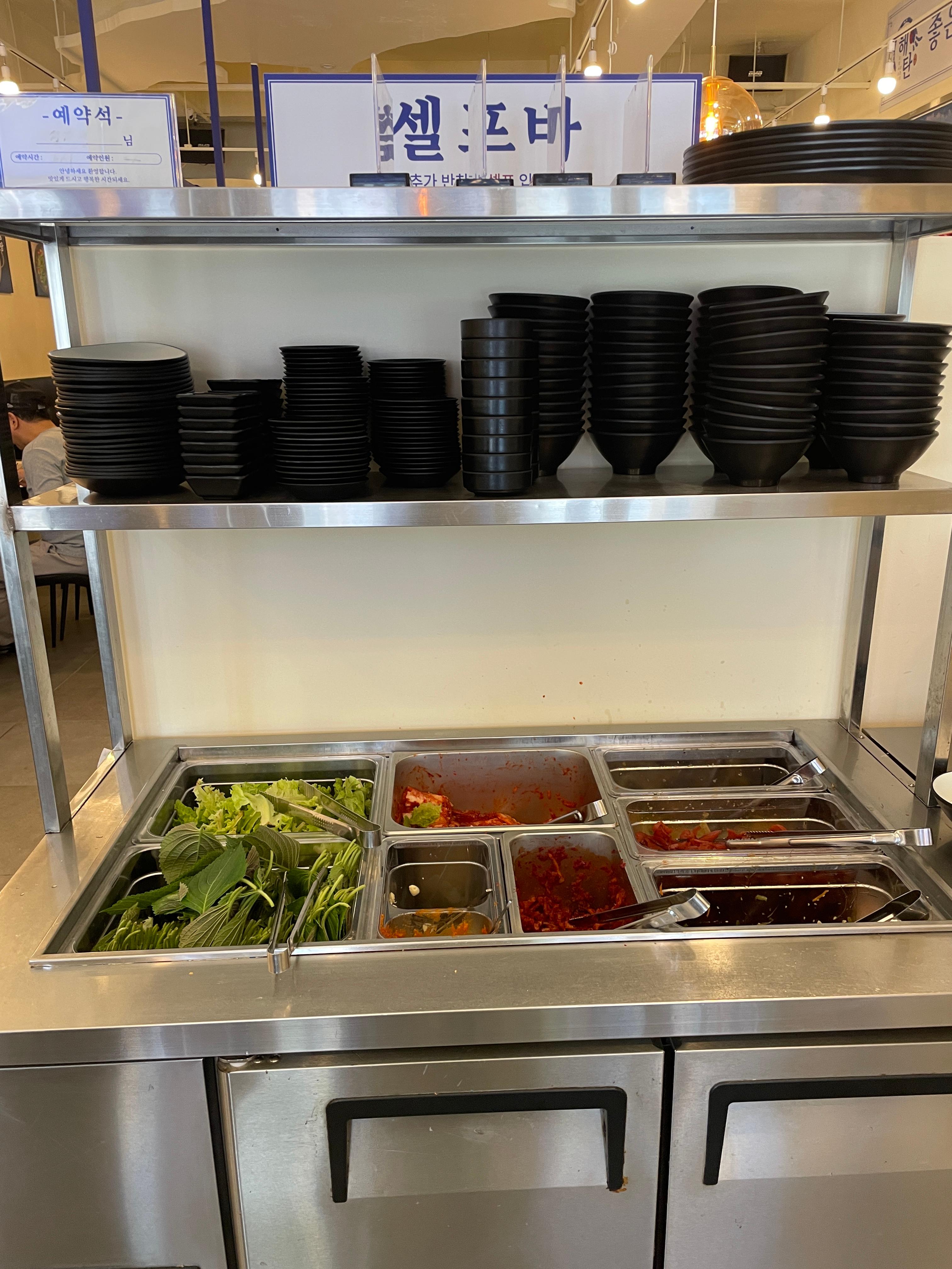 식당안에 들어가보니 무한리플 숭늉과 공기밥 코너가있구요 그옆에 밑반찬과 쌈류는 리필해서 드실 수 있는 셀프코너가 준비되어있어서 리필할때 눈치안보고 먹을 수 있어서 좋았습니다