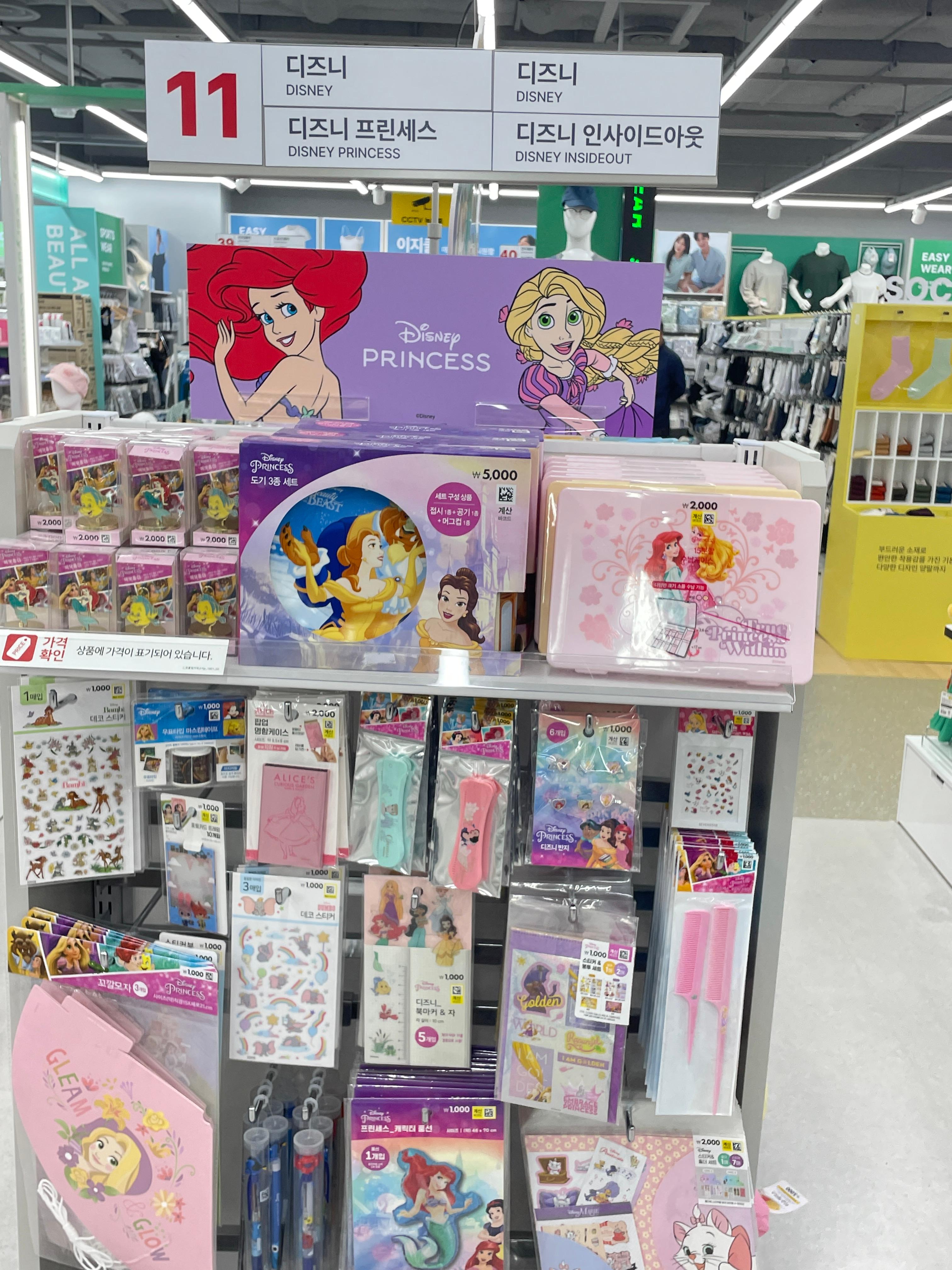제가 제일 많은 시간을 보내는 곳이구요 다른 다이소는 몇개의 디즈니 아이템만 구비되어있는 반면에 캐릭터별로 아주 많은 제품이 있어서 어른들도 구경하는 재미가 쏠쏠하드라구요 저도 디즈니 좋아하거든요