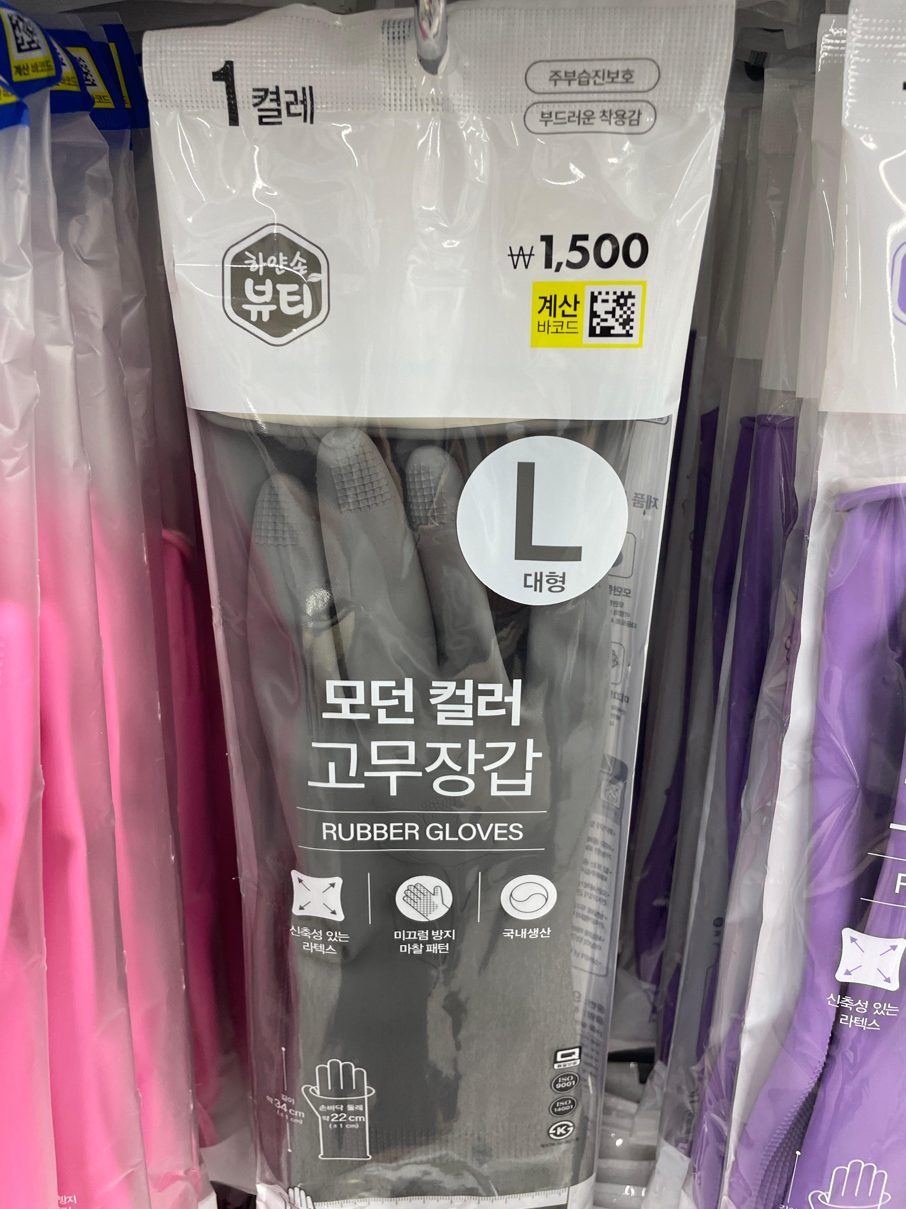 매번 브랜드로 마트에서 구매했는데 다이소에서 모던컬러 고무장갑 쓰는데 너무 괜찮은거예요 그래서 쟁여놓고 쓰는 아이템이구요 저희엄마도 이걸로 갈아타셨답니다.