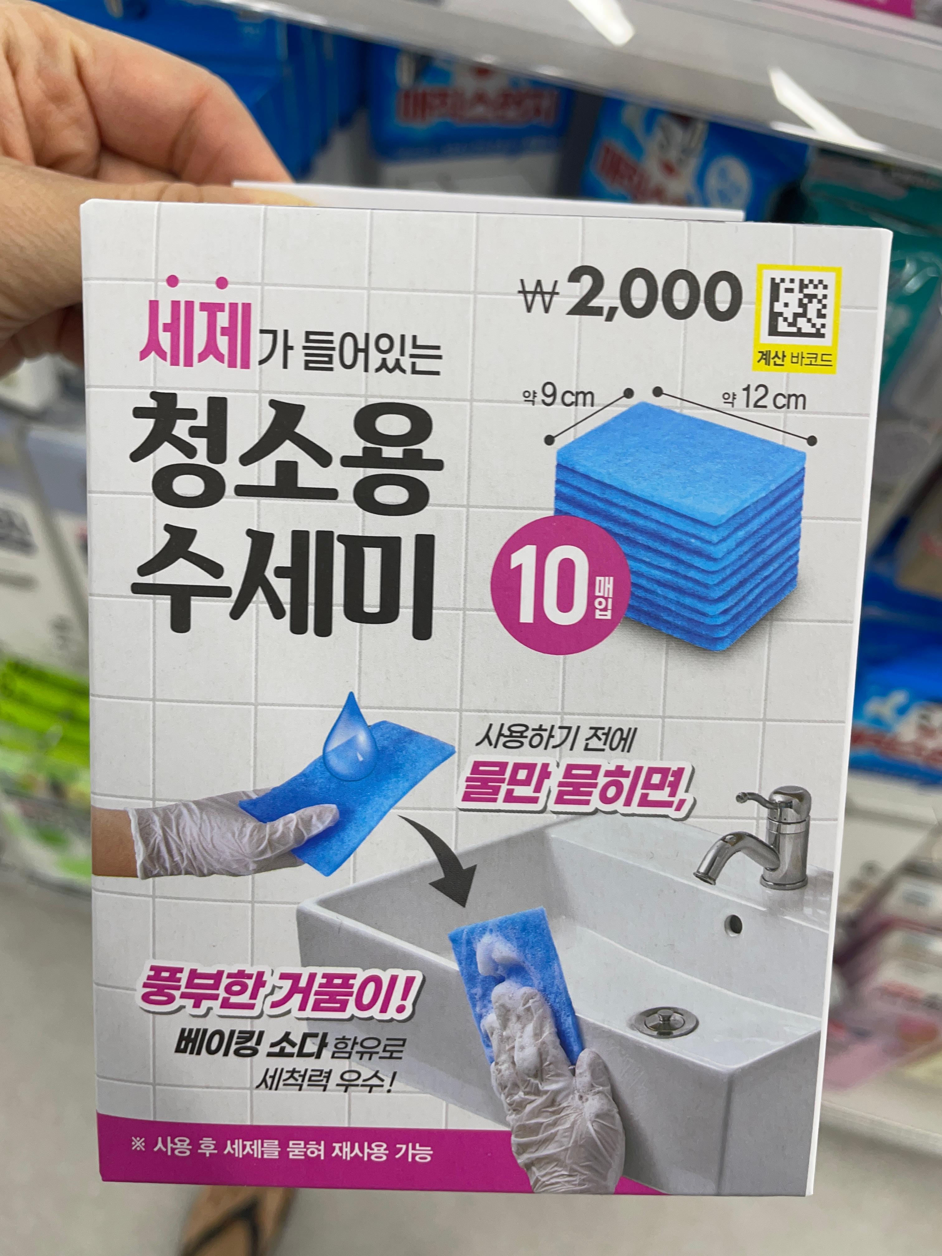저게 가는 지점마다 품절인곳이 많은데 여기에는 재고가 꽉꽉 물만뭍히면 거품이 나는 일회용 수세미인데요 욕실청소할때 아주 요긴하게 사용해서 쟁여놓고 쓰는 아이템입니다. 요제품 개인적으로 너무 좋드라구요 사용후에 세제를 뭍혀서 재사용도 가능하다고하니 일회용아니고 다회용이네요