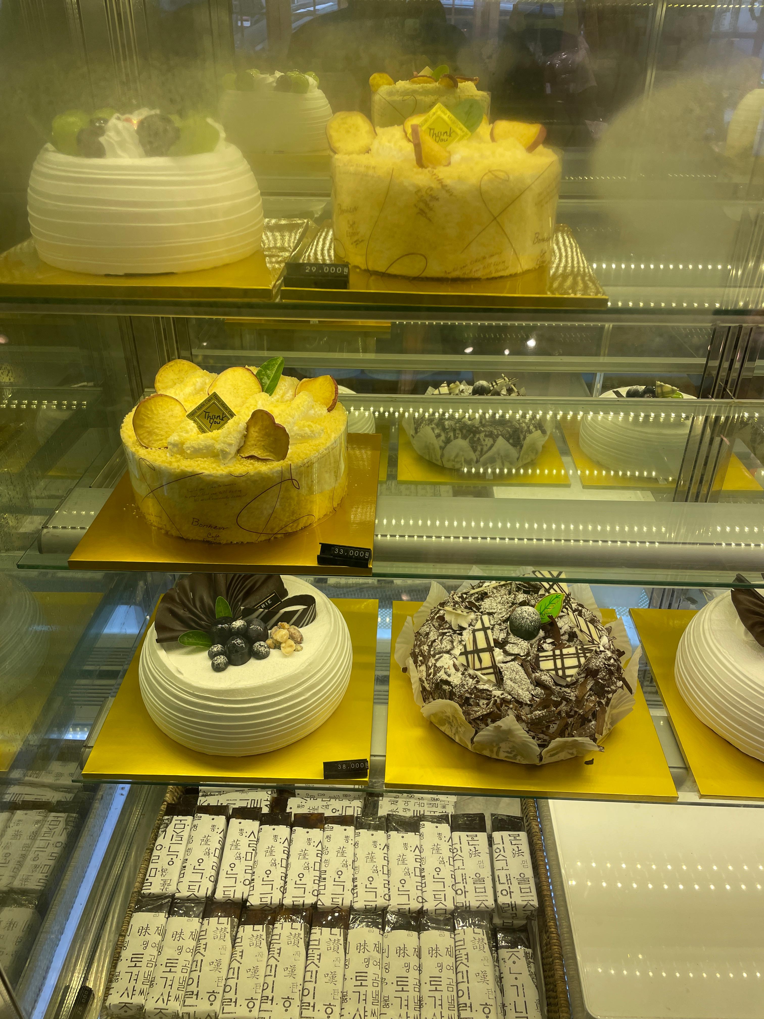 쇼케이스에 모양은 엄청나게 화려하지 않은 효자베이커리스러운 데코의 케이크도 보입니다