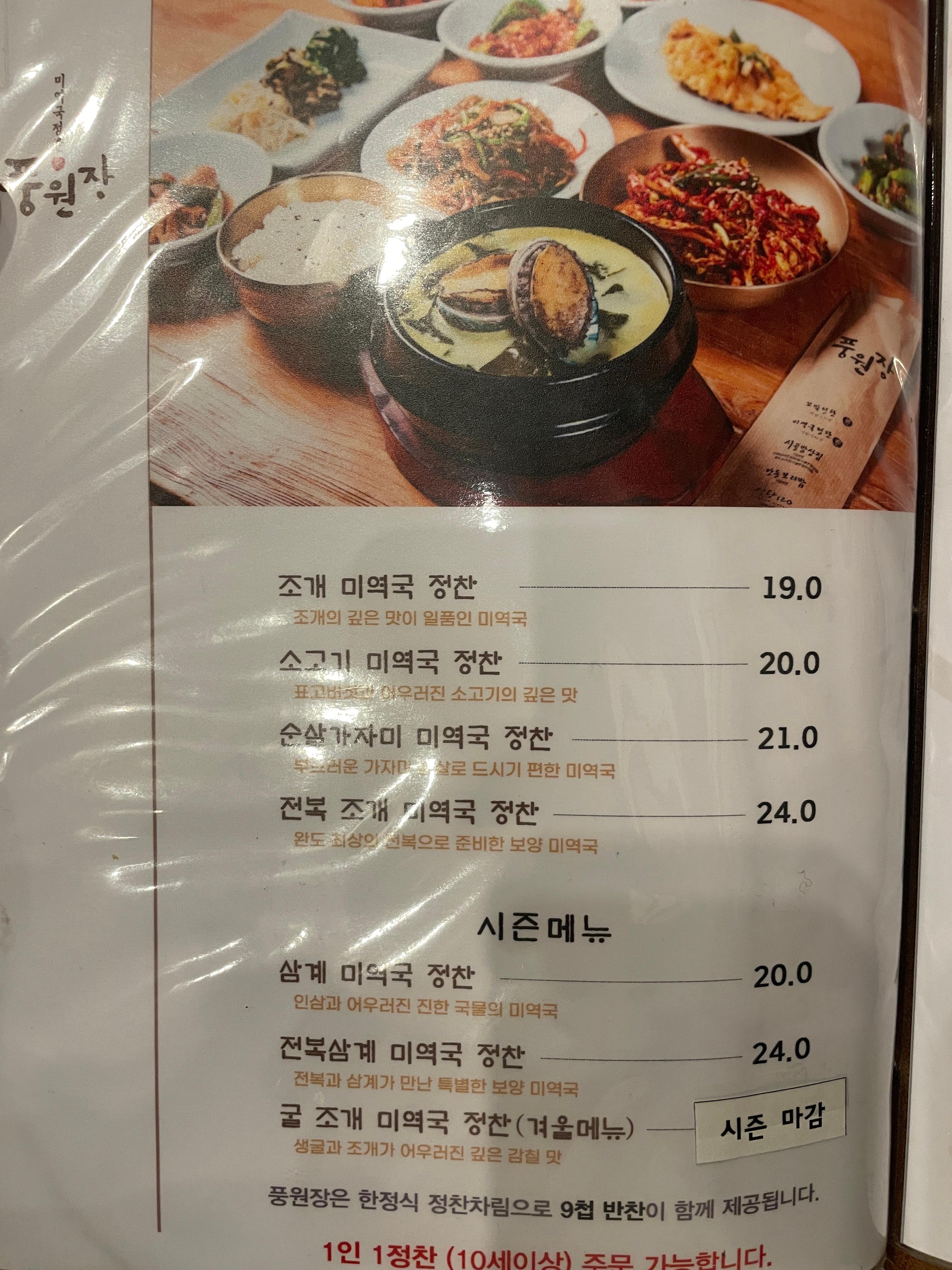 📍대표메뉴: 소고기미역국 정찬 20,000원 조개미역국 정찬 19,000원 활전복조개미역국 정찬 24,000